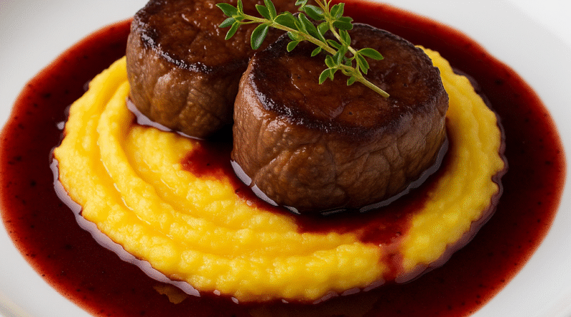 🥩 2. Medalhão de Carne com Purê de Mandioquinha e Molho de Vinho